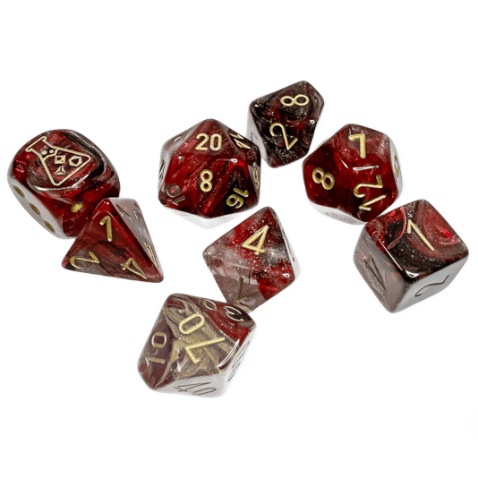 Blikvanger: Transparante, gemarmerde rode-blauwe dice met subtiele glitter en gouden cijfers voor een opvallende visuele flair.