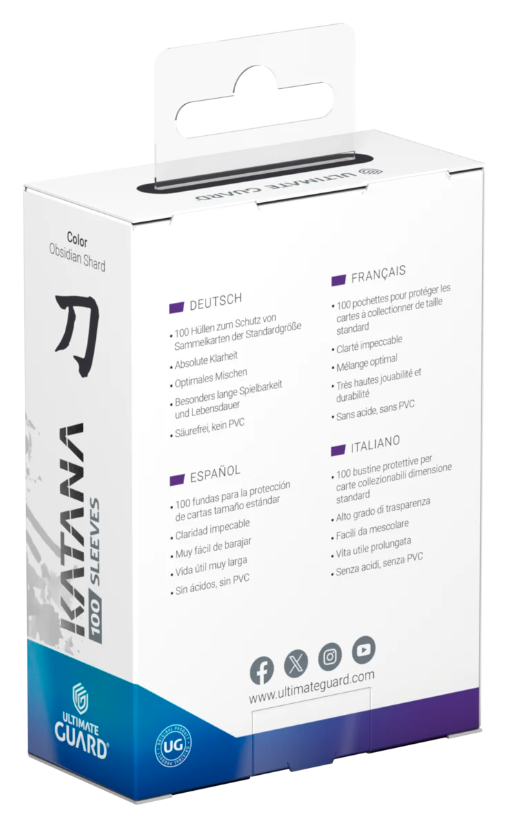 De Katana Sleeves zijn vervaardigd in Japan, waar precisie en vakmanschap samenkomen. Ze zijn ontwikkeld voor langdurig gebruik tijdens intensieve speelsessies zoals toernooien, draftavonden of Commander-games. Elke verpakking bevat 100 sleeves, geschikt voor standaardformaat kaarten zoals Magic: The Gathering, Pokémon en andere verzamelkaartspellen.